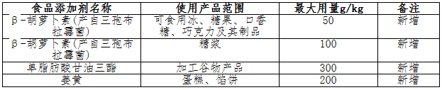 ,拟修订食品添加剂使用标准,具体为新增部分食品中β-胡萝卜素(产自三孢布拉霉菌)等多种食品添加剂的使用条件,具体内容部分见下表。该修订意见反馈期截至2023年11月7日。