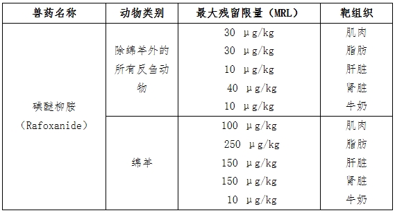 欧盟官方公报2023年10月23日消息,欧盟委员会于10月20日通过(EU)2023/2203条例制订动物食品中兽药碘醚柳胺(Rafoxanide)最大残留限量,公布后第20日生效,主要内容见下表。
