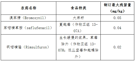 2023年10月19日,加拿大卫生部发布通告,确定部分食品中溴苯腈(Bromoxynil)、砜嘧磺隆(Rimsulfuron)、苯嘧磺草胺(Saflufenacil)最大残留限量如下表所示,以上限量已于2023年10月11日生效并进入最大残留限量数据库。