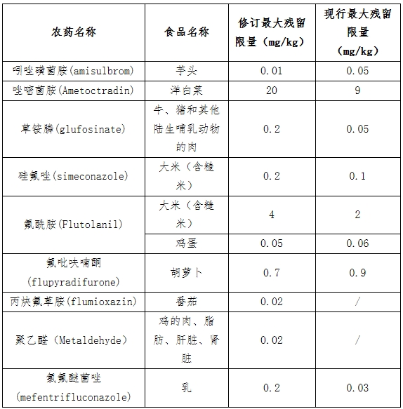 2023年10月18日,日本厚生劳动省发布健生发1018第2号公告,修订《食品和食品添加剂标准》。主要内容为修订部分食品中吲唑磺菌胺等多种农兽药的最大残留限量,部分具体限量见下表。该公告自发布之日起实施,吲唑磺菌胺等化合物的限量变化自发布之日起一年后生效。