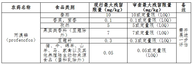 2023年12月1日,欧洲食品安全局(EFSA)发布10.2903/j.efsa.2023.8445号 ,审查部分食品中丙溴磷(profenofos)的最大残留限量。具体审查意见见下表。