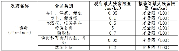 2023年11月30日,欧洲食品安全局(EFSA)发布10.2903/j.efsa.2023.8426号 ,拟修订部分食品中二嗪磷(diazinon)的最大残留限量。具体见下表。该修订将在欧盟官方公报发布后正式生效。