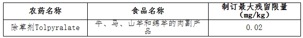 美国联邦公报2023年11月24日消息,美国环保署(EPA)发布2023-25871号公告,制订部分食品中除草剂Tolpyralate的最大残留限量,具体如下表。