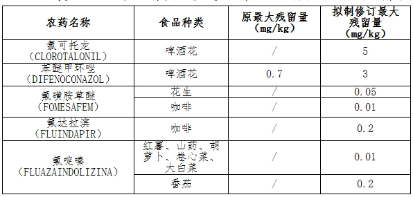 ,拟制修订部分食品中氯可托龙等农药的最大残留限量,部分限量见下表。