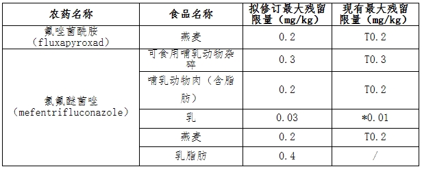 2023年12月7日,澳大利亚农药和兽药管理局(APVMA)发布通告,拟修订部分食品中氟唑菌酰胺等农药的最大残留量,具体见下表(T代表临时限量,*代表MRL制订在或接近检测限,具体位于文档第23-24自然页)。