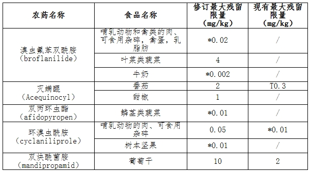 2023年12月7日,澳大利亚联邦公报发布F2023C01084号公告,即新版食品和饲料中农兽药残留限量标准。与旧版标准相比,新版修订更新了食品中溴虫氟苯双酰胺等农药的最大残留限量,部分内容见下表(T代表临时限量,*代表MRL设置在或接近检测限)。