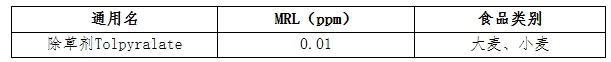 2024年1月18日,加拿大卫生部发布PMRL2024-01号咨询 ,有害生物管理局拟修订除草剂Tolpyralate的最大残留限量。本 评议期为发布之日起75天,至2024年4月2日。具体信息如下: