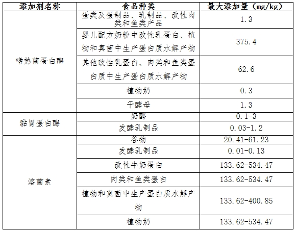 2024年2月26日,欧洲食品安全局发布2024.8634、8633、8612号 ,拟制订嗜热菌蛋白酶和黏胃蛋白酶、溶菌素作为食品添加剂的使用规定,具体使用要求如下表。