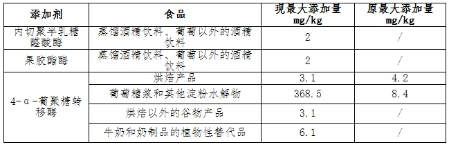2024年4月5日,欧洲食品安全局(EFSA)发布2024.8701、2024.8700、2024.8698号 ,拟制订内切聚半乳糖醛酸酶、果胶酯酶、4-α-葡聚糖转移酶作为食品添加剂的使用规定,具体使用要求如下表。该 将于欧盟官方公报正式发布之日起生效。