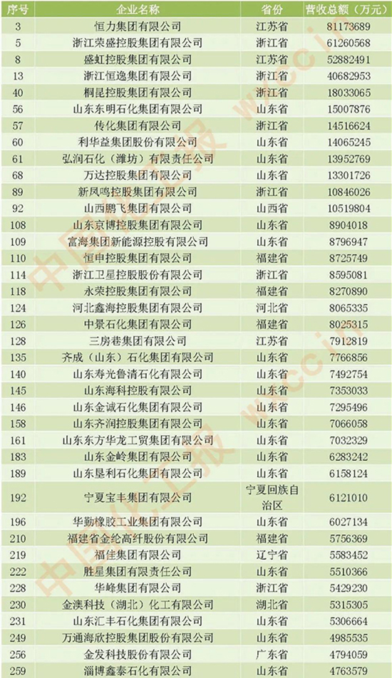 民营化工企业前10强的是:恒力集团有限公司(第3名,以下数字表示位次)、浙江荣盛控股集团有限公司(5)、盛虹控股集团有限公司(8)、浙江恒逸集团有限公司(13)、桐昆控股集团有限公司(40)、山东东明石化集团有限公司(56)、传化集团有限公司(57)、利华益集团股份有限公司(60)、弘润石化(潍坊)有限责任公司(61)、万达控股集团有限公司(68)。