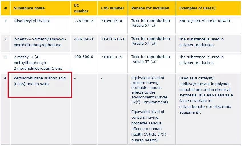 可以看到前三项物质因具有生殖毒性而被列入高度关注物质候选名单,而全氟丁基磺酸及其盐类入选的原因是:可能对人类健康和环境造成严重影响,因此给予与有致癌性、诱变性和再氧化性(CMR)、持久性、生物累积性和毒性(PBT)以及非常持久性和非常生物累积性(vPvB)物质同等水平的关注。