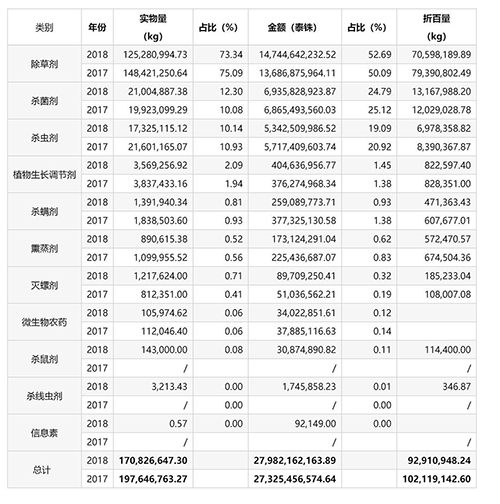 在泰国国民经济中占有重要地位。泰国超过70%的人口从事农业,农产品品种丰富、产量充足。泰国是亚洲唯一的粮食净出口国和世界主要粮食出口国,也是世界五大农产品出口国之一,享有“东南亚粮仓”的美誉。然而,泰国的农作物病虫草害较为严重,农药需求量极大。农药来源主要依赖于进口。2018年度泰国农用农药进口金额达到280亿泰铢,相较2017年度273.63亿泰铢的进口额, 略增2%。从事进口贸易活动的企业数目从2017年的149家增加到177家,进口的农药品种(混剂组合)从267个增加到294个。泰国农药的进口贸易将愈发向竞争激烈和品种多元化的格局转变。此外,泰国对三个大宗产品草甘膦,百草枯和毒死蜱的限用措施即将正式生效,目前泰国市场大宗产品除草剂百草枯的份额几近腰斩,杀虫剂毒死蜱已经跌出进口前十大品种榜单,它们的金额和数量在进口总额中的占比也出现不同程度的下农业降。