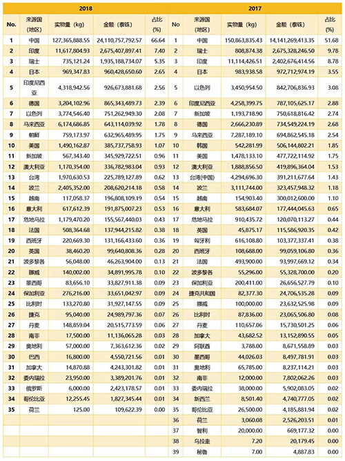 进口来源国(地区)从2017年的39个减少到35个,但来自中国的农药金额占比从51%上升到了66%,产品均价(折百量计算)也提高了近一倍,不过依旧不及同印度尼西亚,巴西,波多黎各这些农药贸易活跃的来源国,并且产品与来自瑞士,日本,新加坡,加拿大等发达国家的产品相比,仍然存在差距。