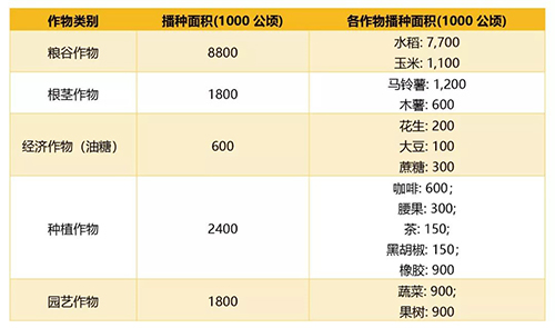 越南农药进口和制剂加工总量约为每年10万吨(实物量),其中除草剂占37%,杀虫剂和杀菌剂各占25%,其它类型产品占13%。每年总用量为5.4万吨,1万吨用于熏蒸,3.6万吨出口到其它国家。越南耕地面积为1150万公顷, 农作物总播种面积1510万公顷,其中水稻是播种最多的作物, 占越南所有作物播种面积的一半以上: