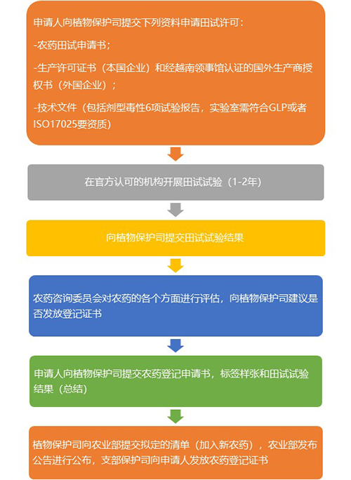 新的有效成分或者新含量/剂型登记耗时约需3年,已经获得登记的产品的扩大应用范围的,约需要1.5年。申请人需要先向农业和农村发展部下属的植物保护司(PPD)提交卷宗获得田试许可,将当地田试结果提交给植物保护司,农药登记技术咨询委员会对农药的各个方面进行评估,向植物保护司提出建议,最终由农业部将农药更新至清单中并向申请人发放公告: