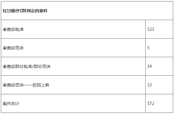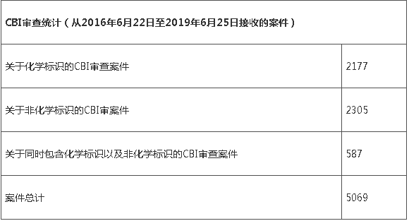 同期EPA发布了2016年6月22日至2019年6月25日收到的CBI审查的统计数据。2016年颁布的TSCA改革法案中,对CBI相关规定也进行了修订。此后,EPA建立了许多新的流程、系统和规程,使提交人能够在提出保密声明时提供所需的信息,促进EPA对这些声明的审查并在适用的情况下做出判定。以下为EPA公布的近三年间CBI案件审查情况。