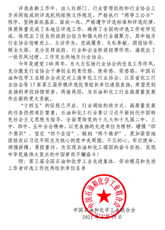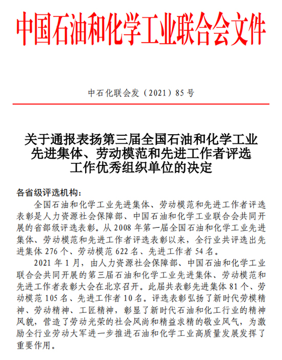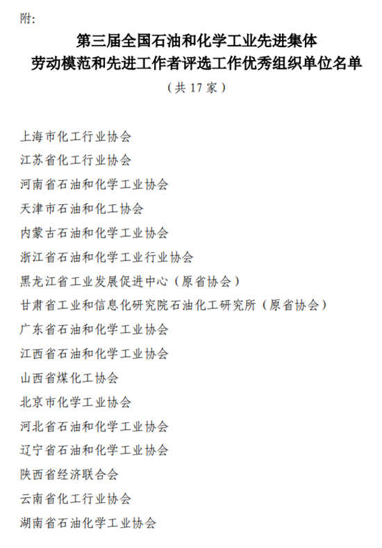 向获得表扬的石油和化工行业先进集体、劳动模范和先进工作者评选工作优秀组织单位表示祝贺!