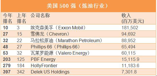 炼油行业榜中,埃克森美孚领跑,年收入为1815亿美元,排名从去年的第三位,大幅下滑至第10位;雪佛龙年收入为947亿美元,位居27位,大幅下降12位;马拉松原油年收入近890亿美元,位居32位,排名下滑10位。