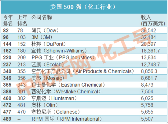 化工行业榜中,陶氏排名最高,年收入为385亿美元,位居总排名82位,下滑4位;3M紧随其后,年收入为322亿美元,位居96位,上升7位;杜邦年收入204亿美元,排名144位,大幅上升8位。