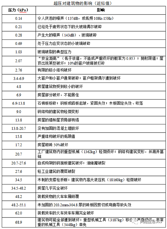 根据《危险化学品生产装置和储存设施外部安全防护距离确定方法》(GB/T 37243-2019)不同超压对建筑物造成的影响和损坏见下表。